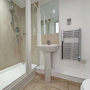 The spacious shower room is a standout feature, with a double shower unit complete with a mixer-controlled shower. The contemporary white bathroom suite is highlighted with chrome fixtures and fittings, a stylish wall mirror, and a heated towel rail, ensuring both luxury and practicality.